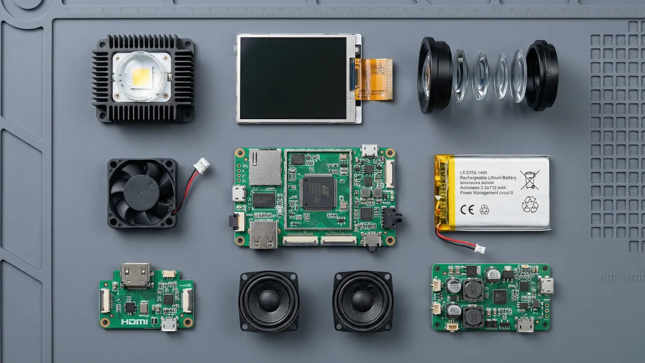 | LCD/DLP display panel | — | 22 | BOE or Innolux 5.0-5.8 inch 1080p TFT-LCD panel at $8-14 for LCD models; TI DLP3310 0.33-inch DMD chip at $22-30 for DLP models. This single component determines native resolution, contrast ratio, and image sharpness ceiling. |
